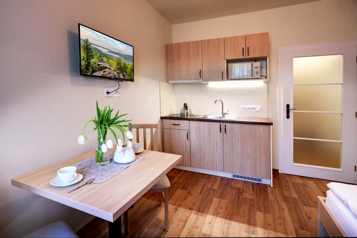 Apartmány Tatra PENZION TATRA JÁCHYMOV Apartmán 1 + 0 Apartmán nabízí ubytování pro 1 osobu. Apartmán má vybavenou kuchyň a koupelnu se sprchovým koutem. Bez možnosti přistýlky Ukázka pokoje Jáchymov Apartmán 1 + 0 Chci rezervaci Rezervace Společné prostory Kontakt